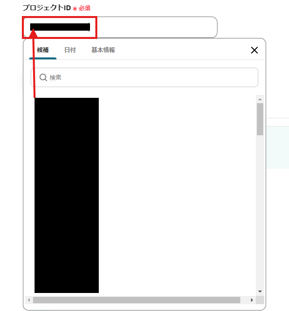 「プロジェクトID」は、入力欄をクリックして表示される候補から選択してください。