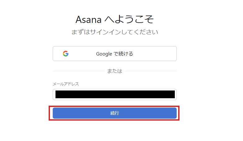 2.表示された画面で、メールアドレスを入力し、「続行」をクリックしてください。