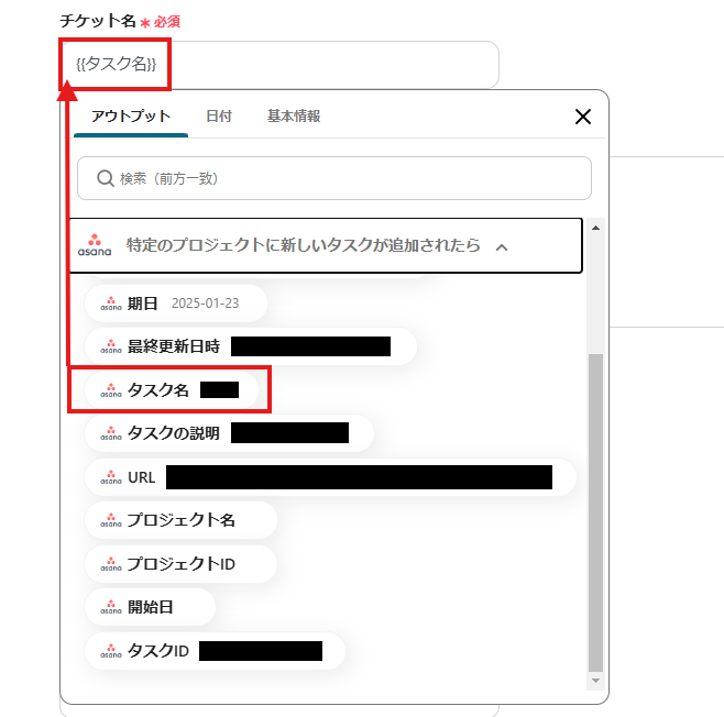 「チケット名」は、入力欄をクリックして表示されるアウトプットから選択してください。