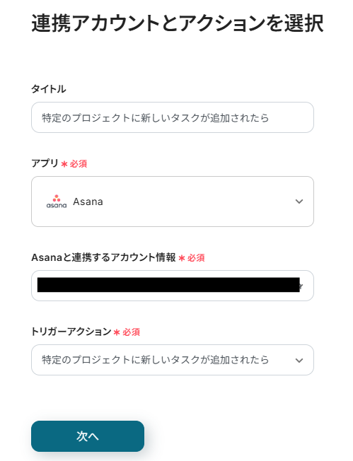 タイトルと連携するアカウント情報を任意で設定し、トリガーアクションはテンプレート通りに「特定のプロジェクトに新しいタスクが追加されたら」のまま「次へ」をクリックして進んでください。