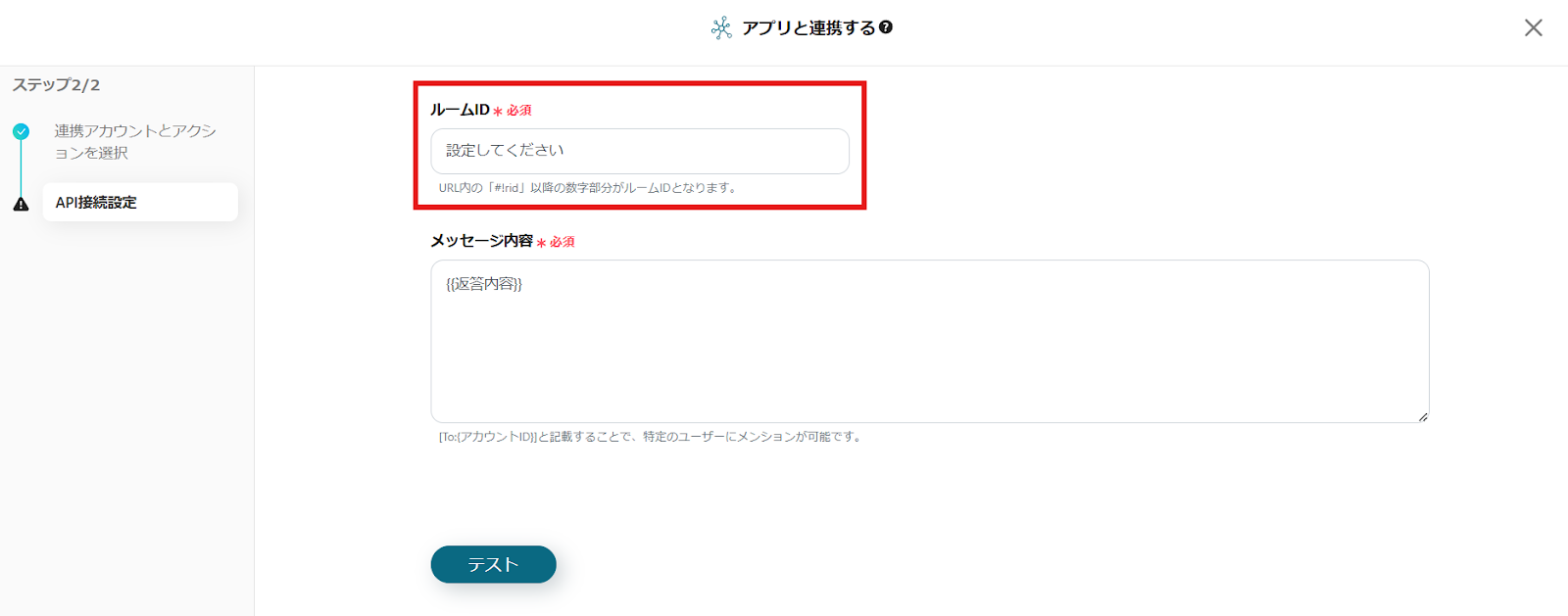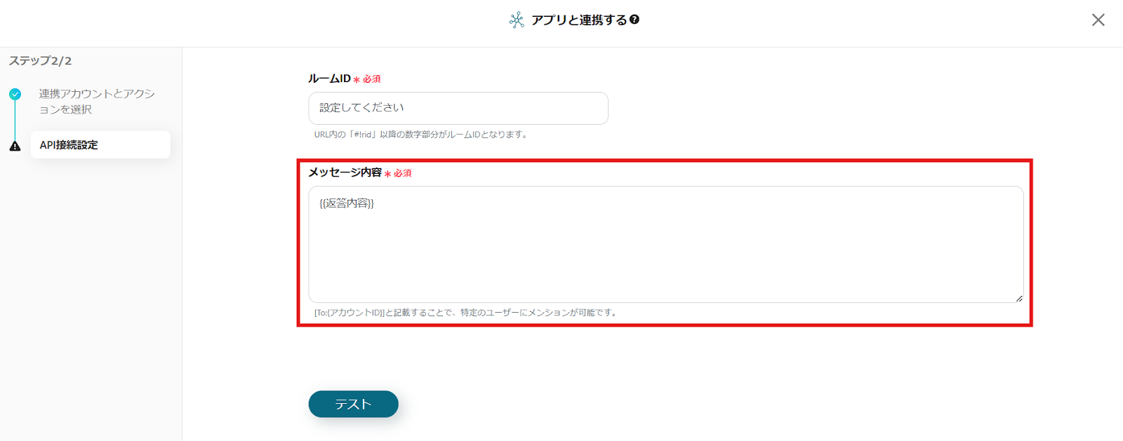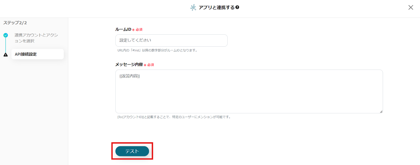 メッセージの設定ができたら、下部にあるテストボタンを押してください。