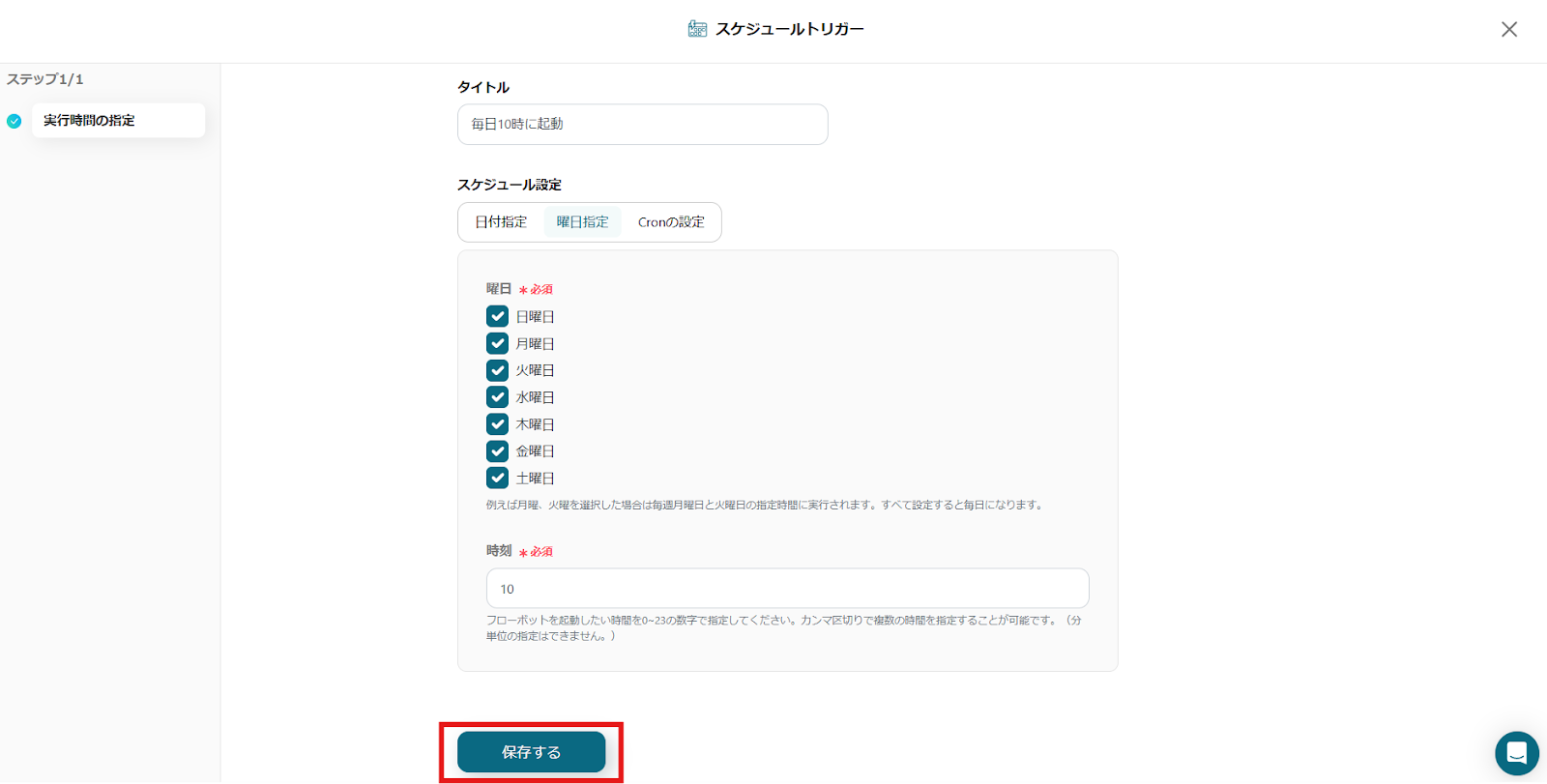 赤枠の必須項目を入力します。画像の設定では、毎朝10時にフローが起動する設定になっています。