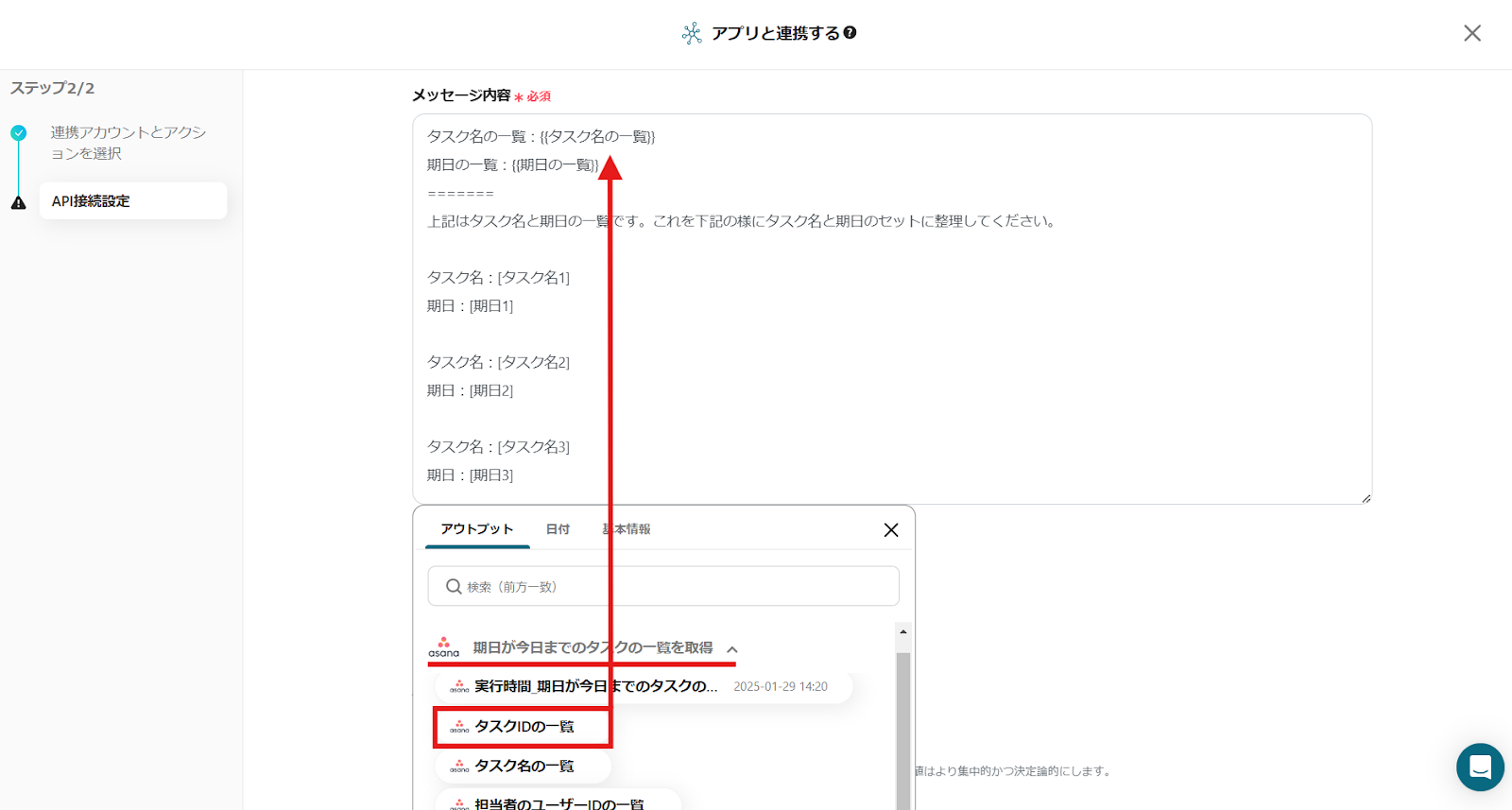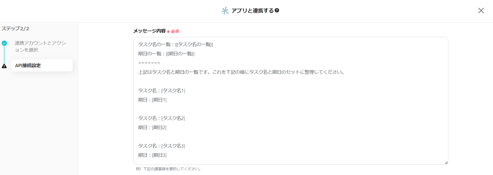 なお、{{タスク名の一覧}}などは画像のようにテストで取得したデータが置換されている状態です。実際には登録されているタスク名が表示された状態で通知されます。