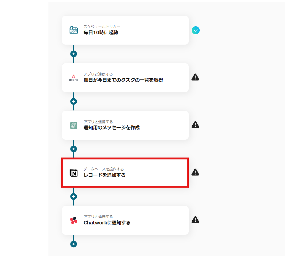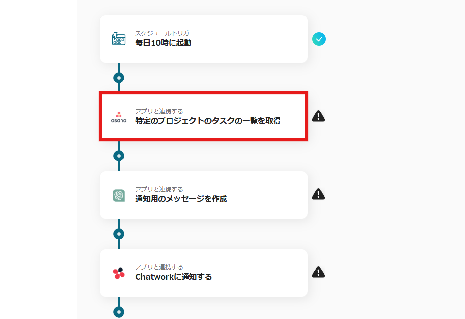 まず、指定した日時に自動化を起動し、AsanaのAPIを用いて期限が今日までのタスクデータを取得したら、ChatGPTのAPIで受け取ります。