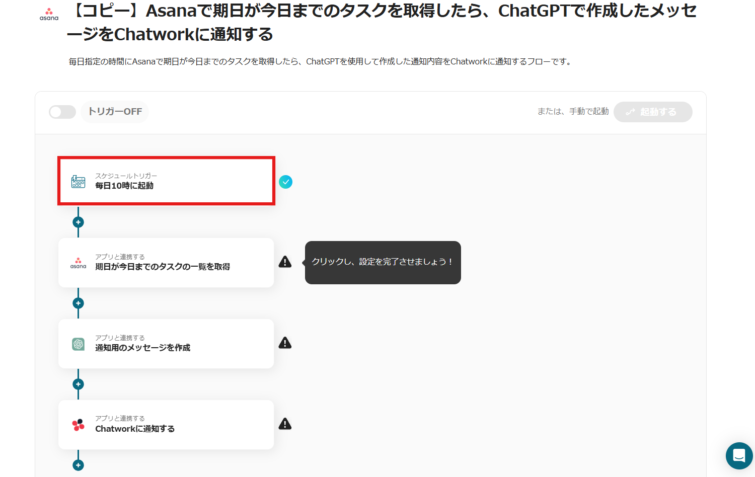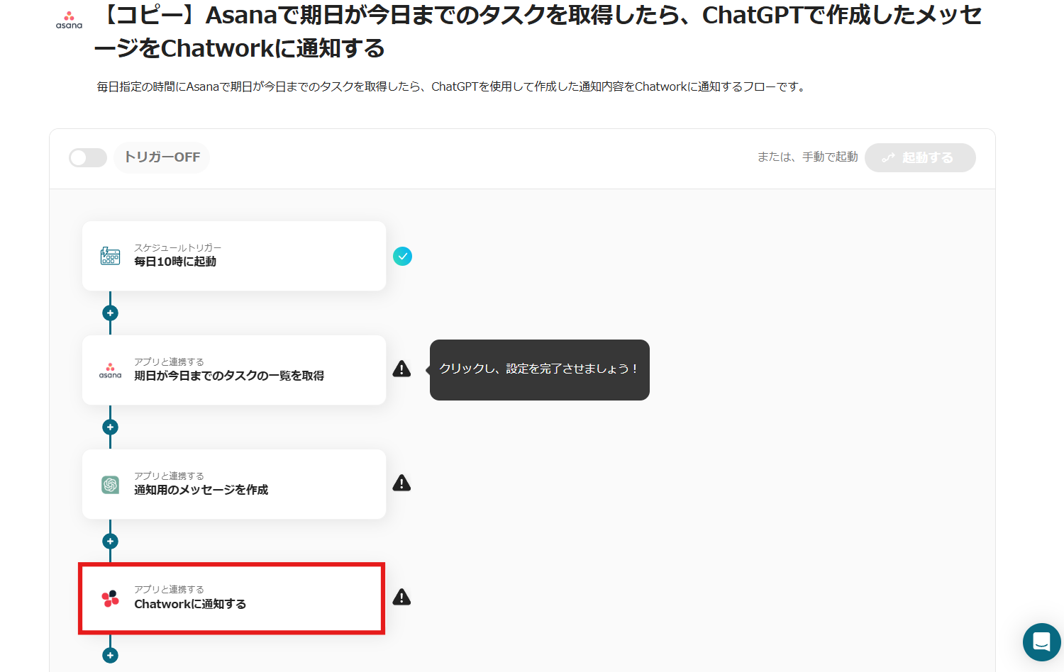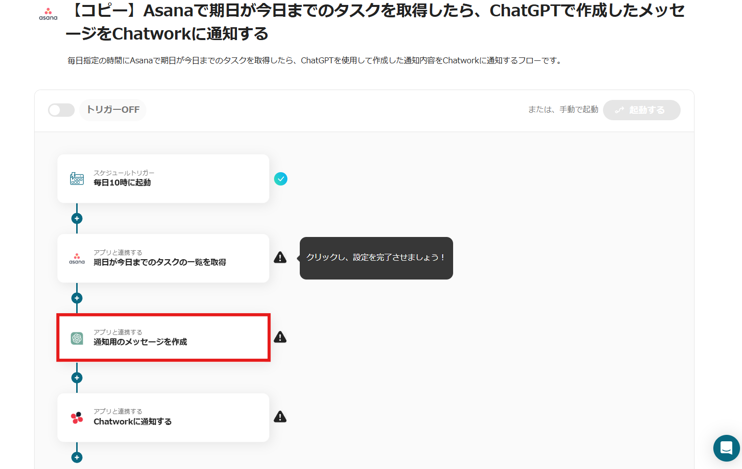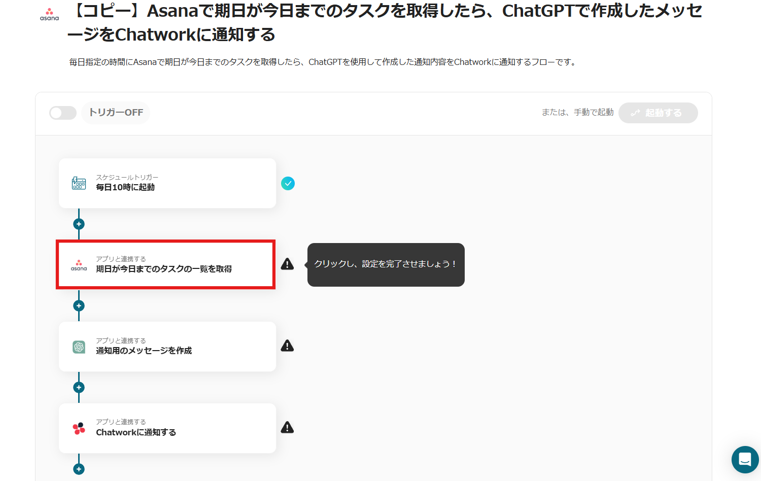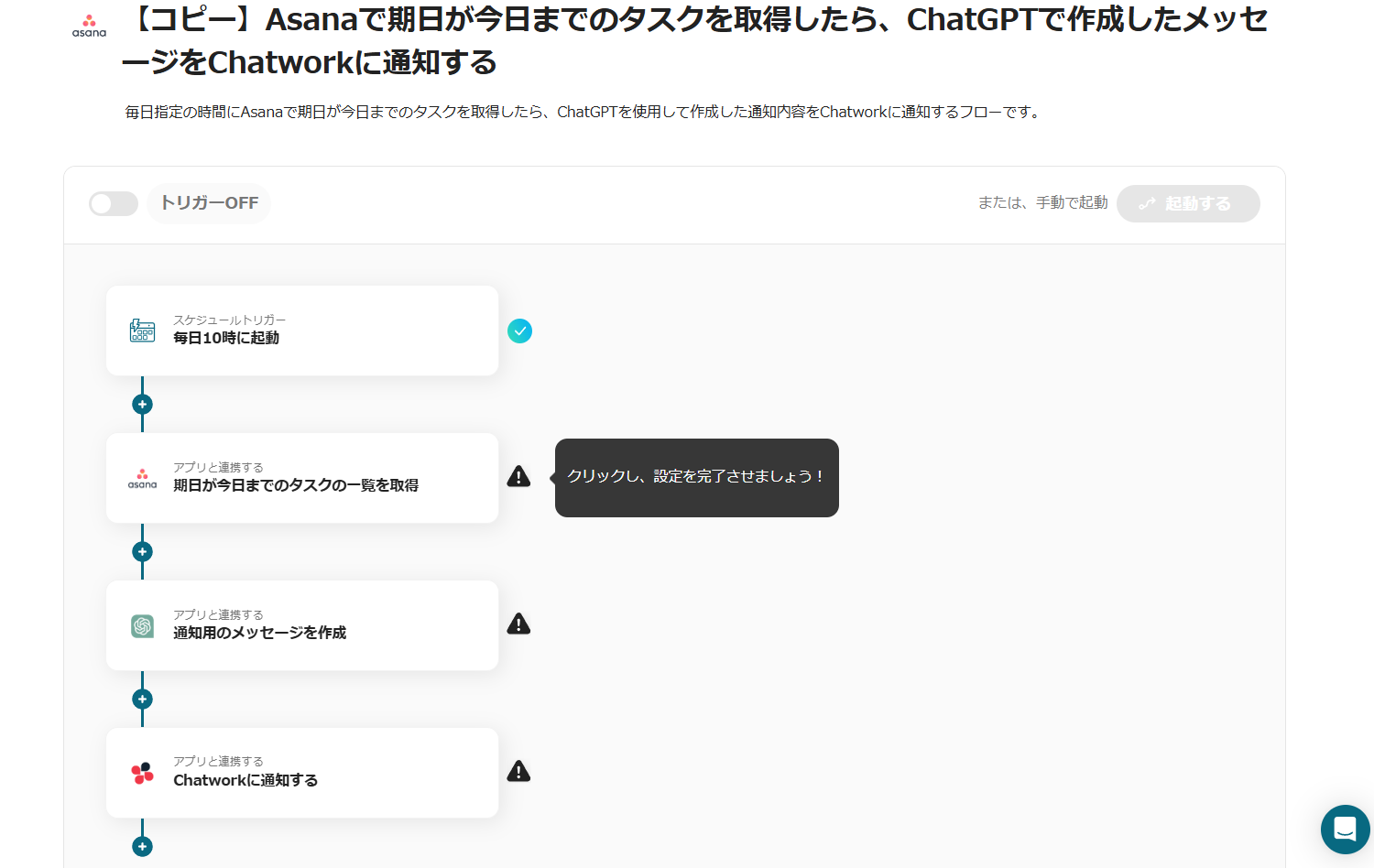 「【コピー】Asanaで期日が今日までのタスクを取得したら、ChatGPTで作成したメッセージをChatworkに通知する」をクリックします。