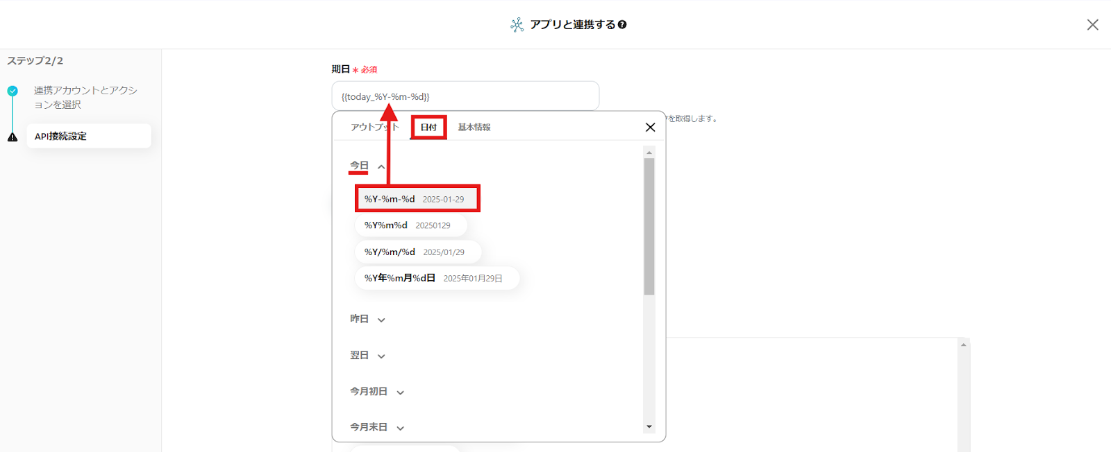 赤枠の部分は期日がいつのもののタスクを取得するかという設定となります。