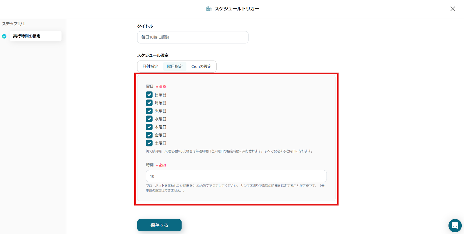 変更がある場合は希望の曜日のチェックボックスをクリックしたり、時刻を記入することで設定できます。
