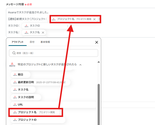 以下の画面のように入力欄をクリックするとアウトプットが表示され、連携したAsanaから取得した値を簡単に入力することができます。