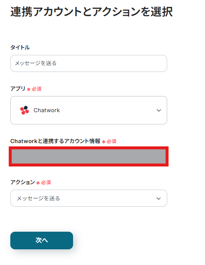 次に連携アカウントとアクションを選択の画面では、今回連携するChatworkのアカウントで間違いないかを確認し「次へ」をクリックします。