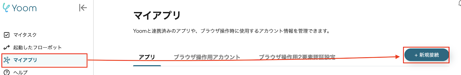 Asanaの登録と同様、Yoomの画面左側にある「マイアプリ」→「新規接続」をクリックしましょう。