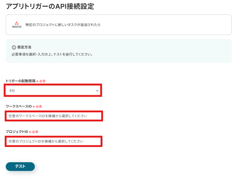 Asanaで新しいタスクが作成されたことをYoomのAPIを用いて検知するための設定を行います。