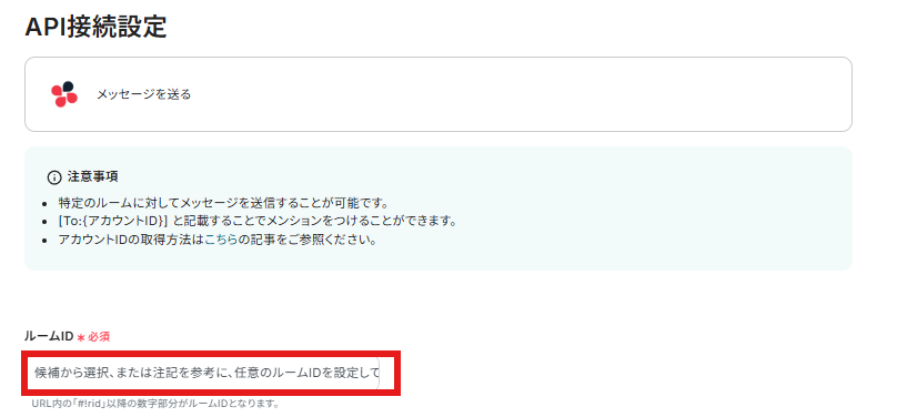 API接続設定の画面が表示されるので、今回通知を受け取りたいルームIDをChatworkで確認し入力しましょう。