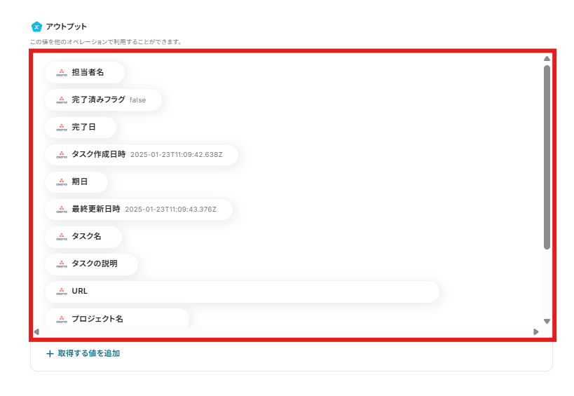 テストをクリックすると、連携したAsanaから取得した内容「アウトプット」が表示されます。