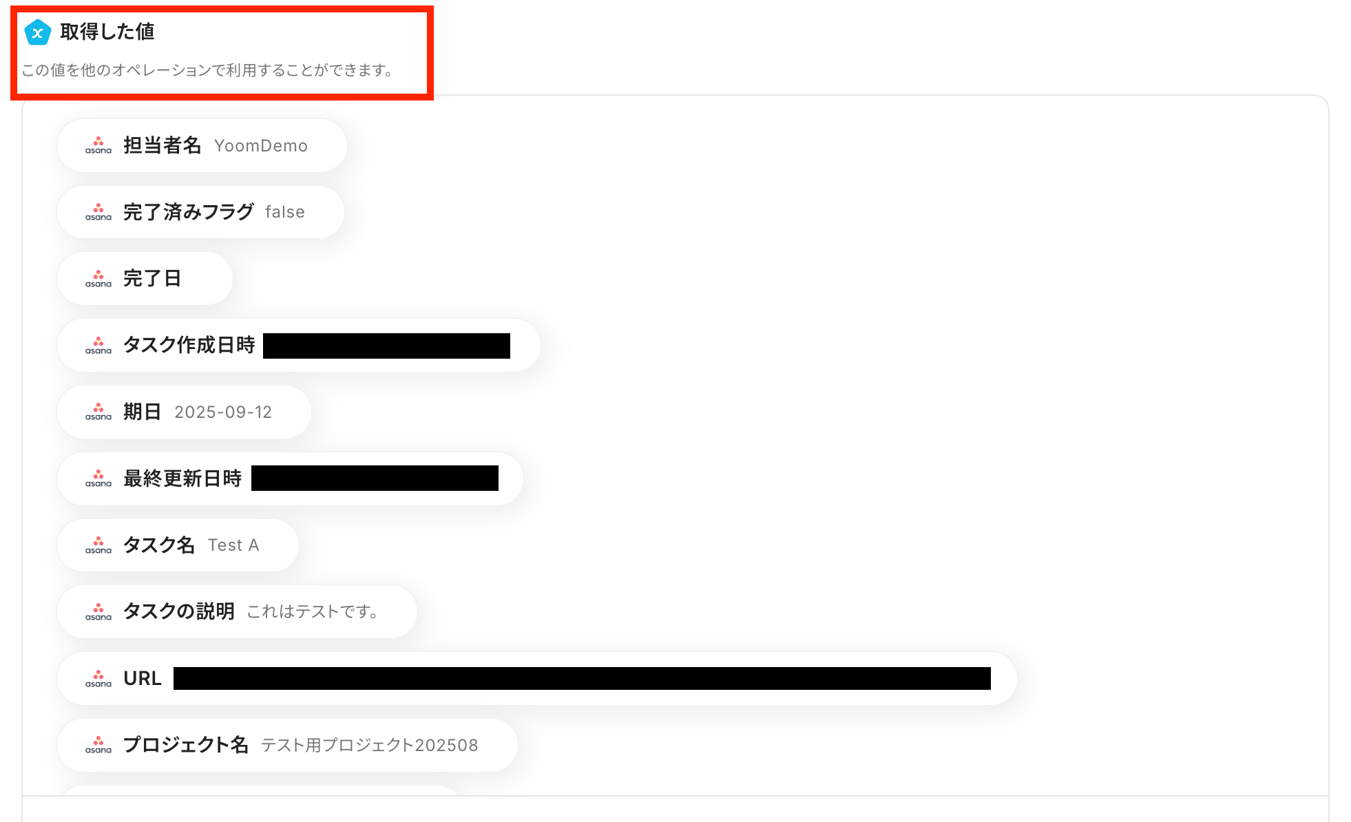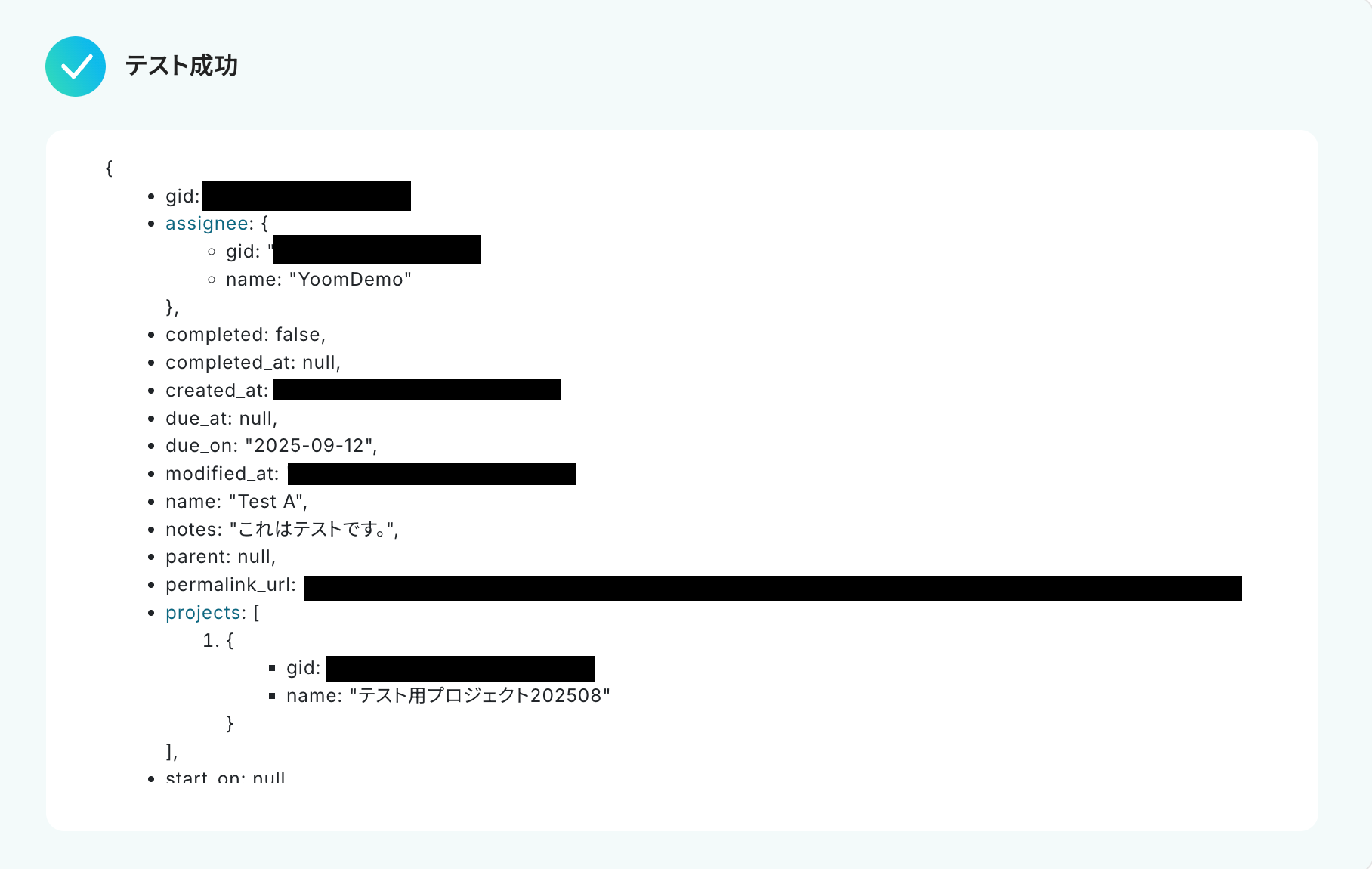 テストが成功すると取得した値が表示され、今作成したAsanaのデータが確認できます。「保存する」をクリックして完了です!