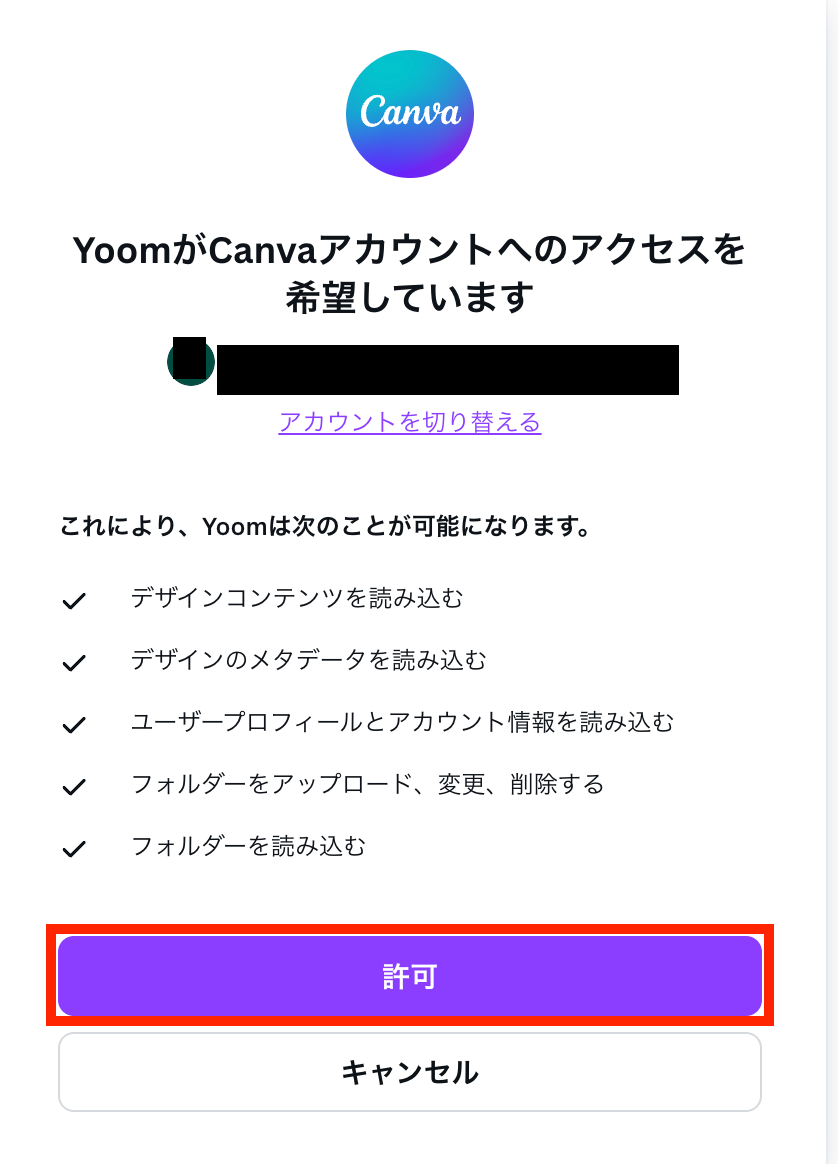 Canvaと連携するアカウント情報に間違いがないかを確認します。 アクションはテンプレートのままで問題ありません。次の設定へ移りましょう!