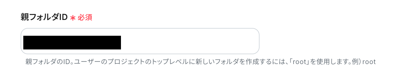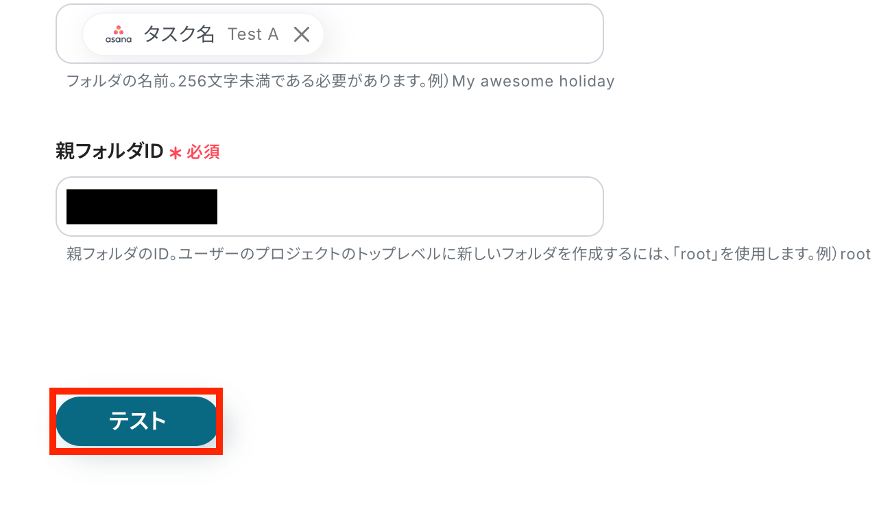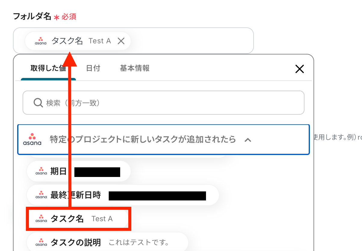 フォルダ名を設定します。Asanaで取得した値でフォルダ名を設定しましょう。ボックスをクリックすることで選択可能です。このように取得した値を活用することで、フローが起動する度に最新のAsanaのデータをその都度Canvaに反映可能です!