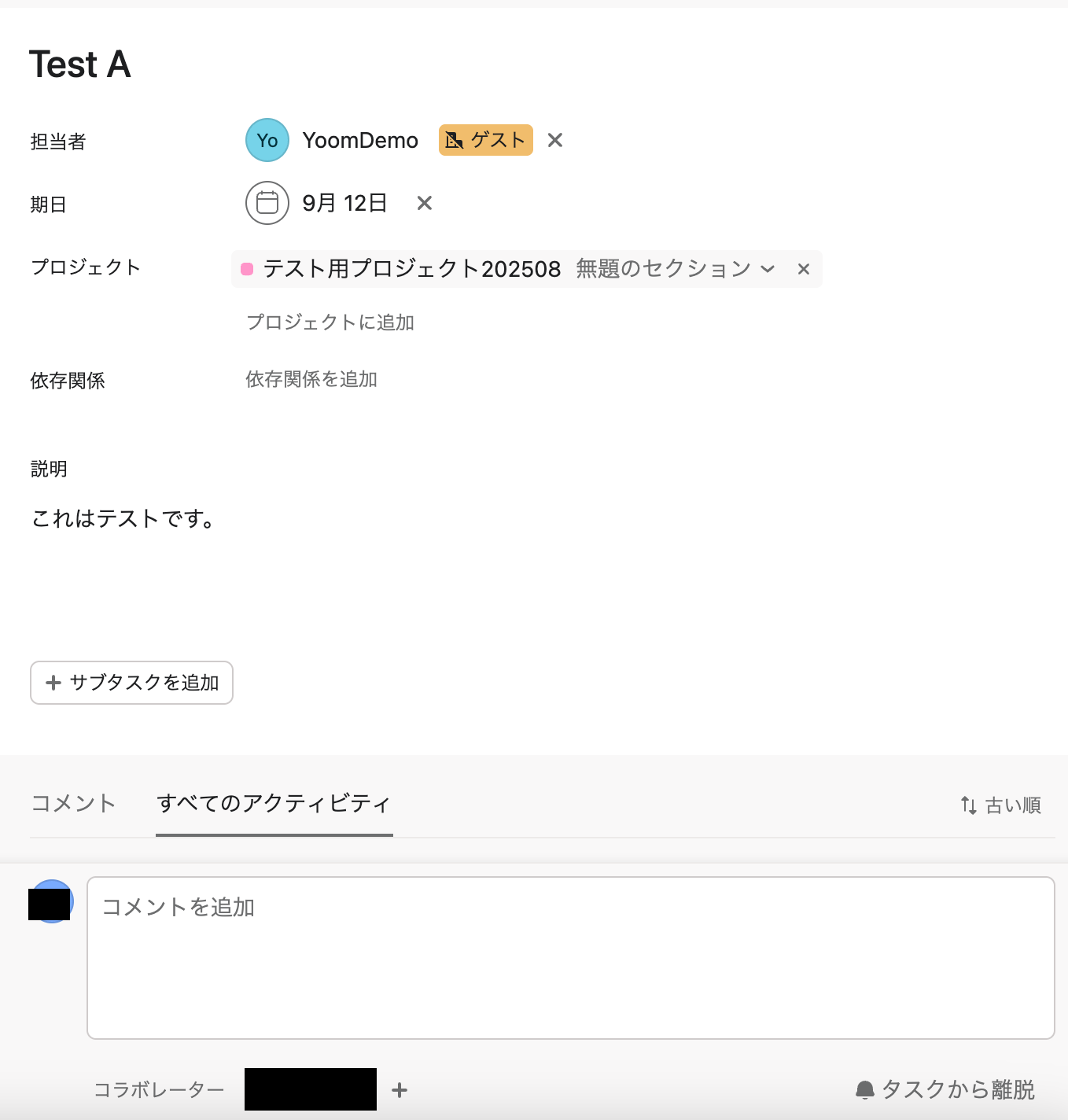 次にYoomでの設定テストで必要になるため、Asana上でタスクを作成しましょう! ※今回はこのようなテストタスクを作成しました。