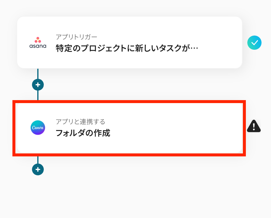 ステップ4:Canvaのアクション設定 Asanaから取得した値を利用して、Canvaでフォルダを作成する設定を行います。 2つ目の赤枠をクリックしましょう。