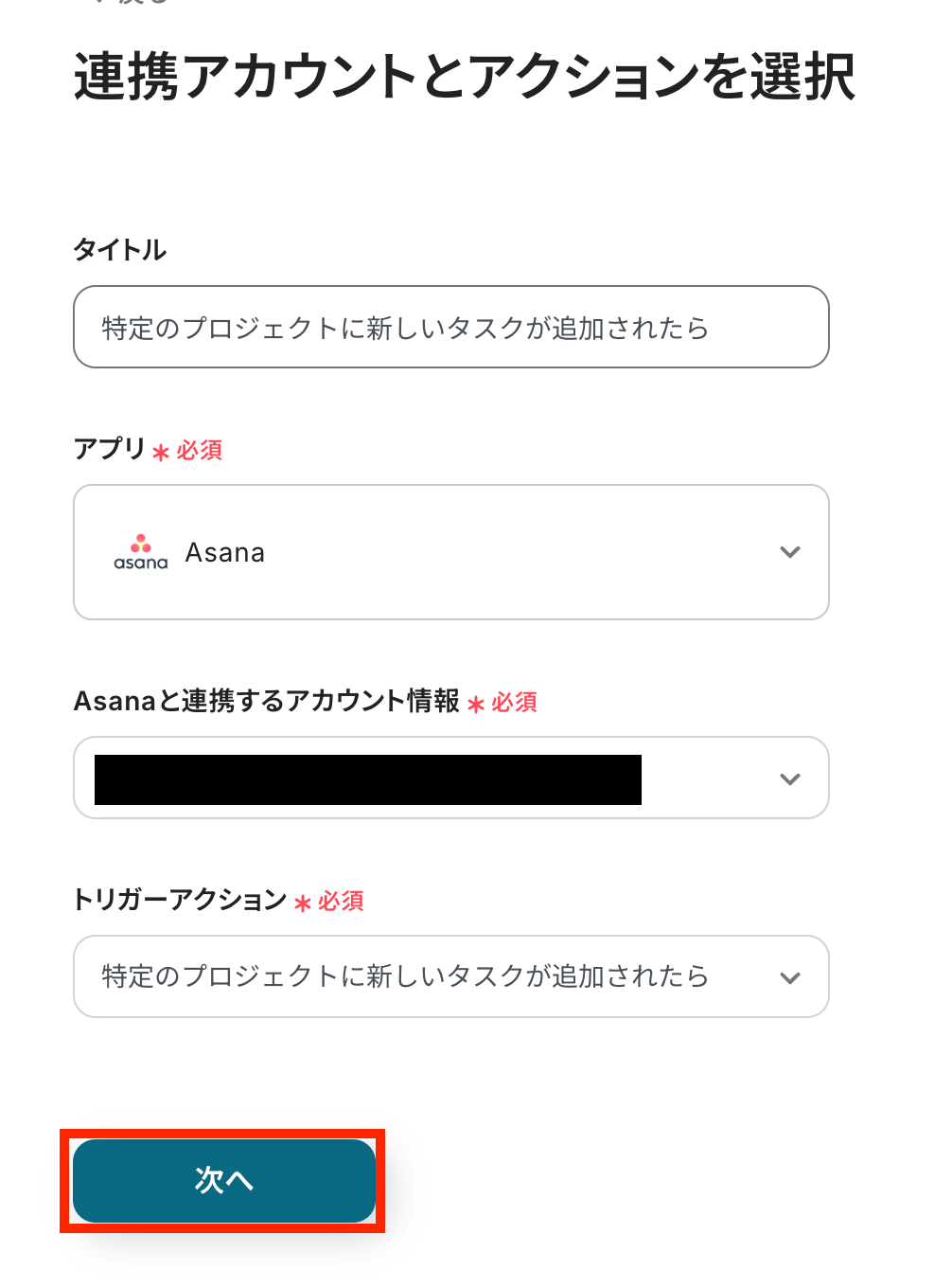 連携アカウントとアクションを選択しましょう。 アクションは、テンプレート通りに「特定のプロジェクトに新しいタスクが追加されたら」のままで大丈夫です。 「次へ」をクリックして進んでください。