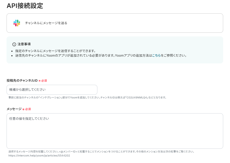 通知を受け取りたいSlackの情報と、メッセージを設定しましょう。