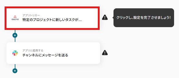 このステップでは、Asanaで特定のプロジェクトに新しいタスクが追加されたことをYoomのAPIで検知し、その通知をSlackへ送るための設定を行います。