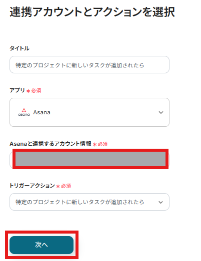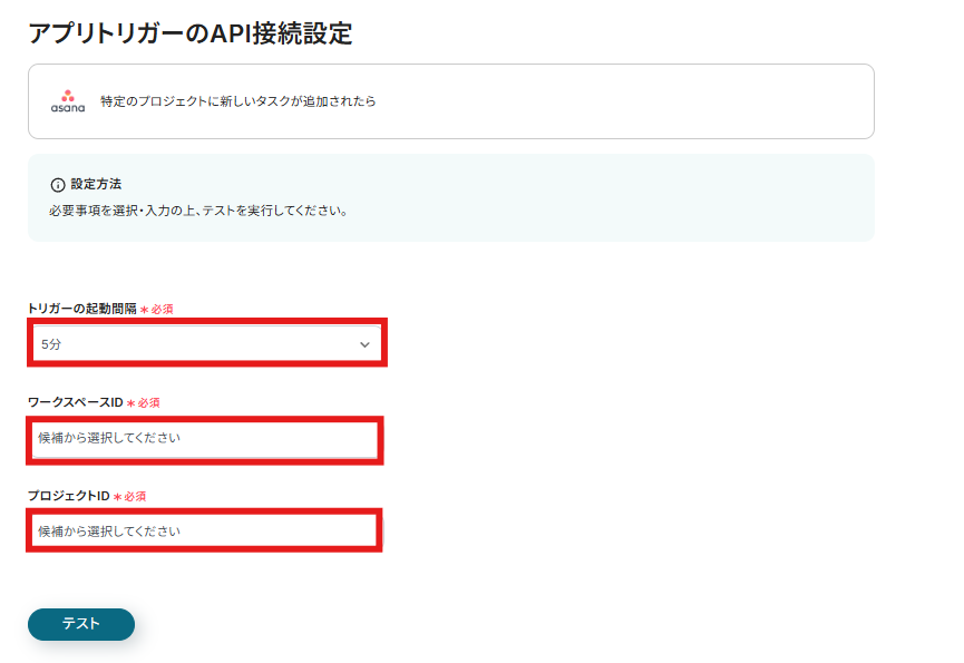 ・Asanaの「特定のプロジェクトに新しいタスクが追加されたら」というトリガーで、プロジェクトを指定してください。