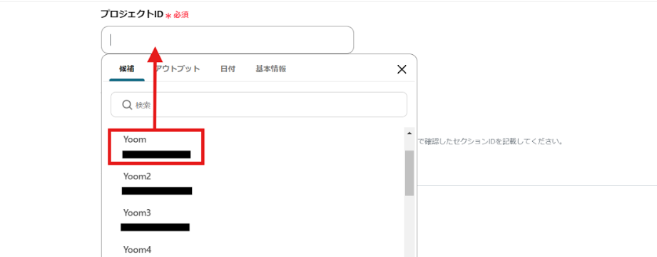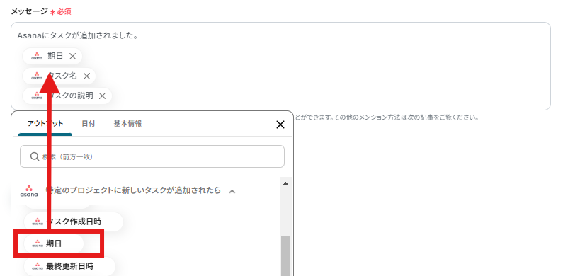 アウトプット(取得した値)は連携したAsanaから取得した情報を簡単に入力できます。