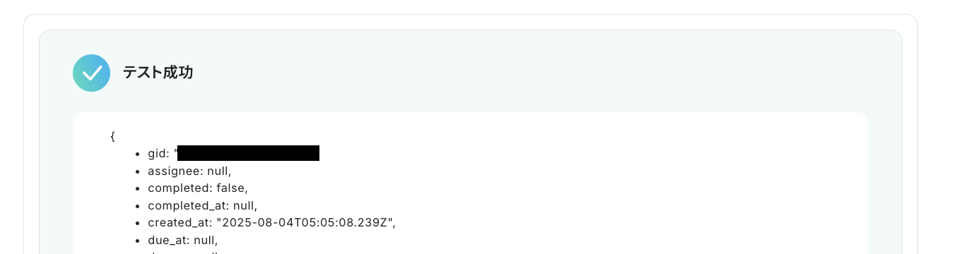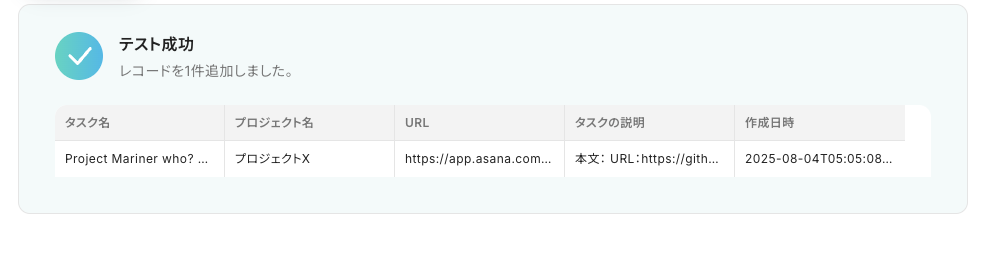 情報設定後、実際にAsana側でトリガーとなるアクション(今回は指定したプロジェクト内に新規タスクを追加)を行い「テスト」をクリックしてください。