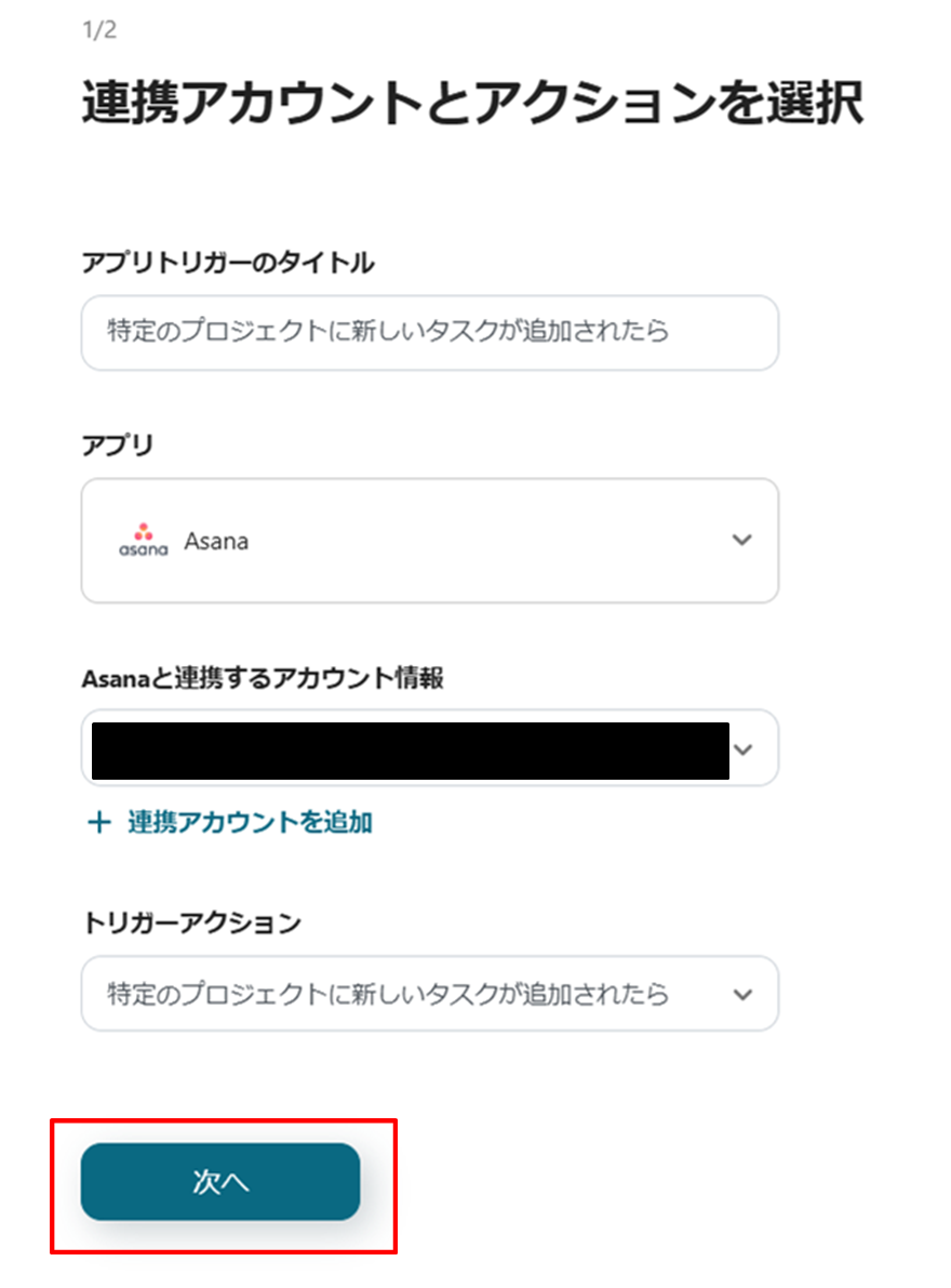 (2)Asanaと連携するアカウント情報に誤りがないかを確認し、「次へ」をクリックします。