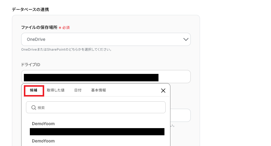 「ファイルの保存場所」はプルダウンから選択し、「ドライブID」は入力バーをクリック後の【候補】から選択しましょう。