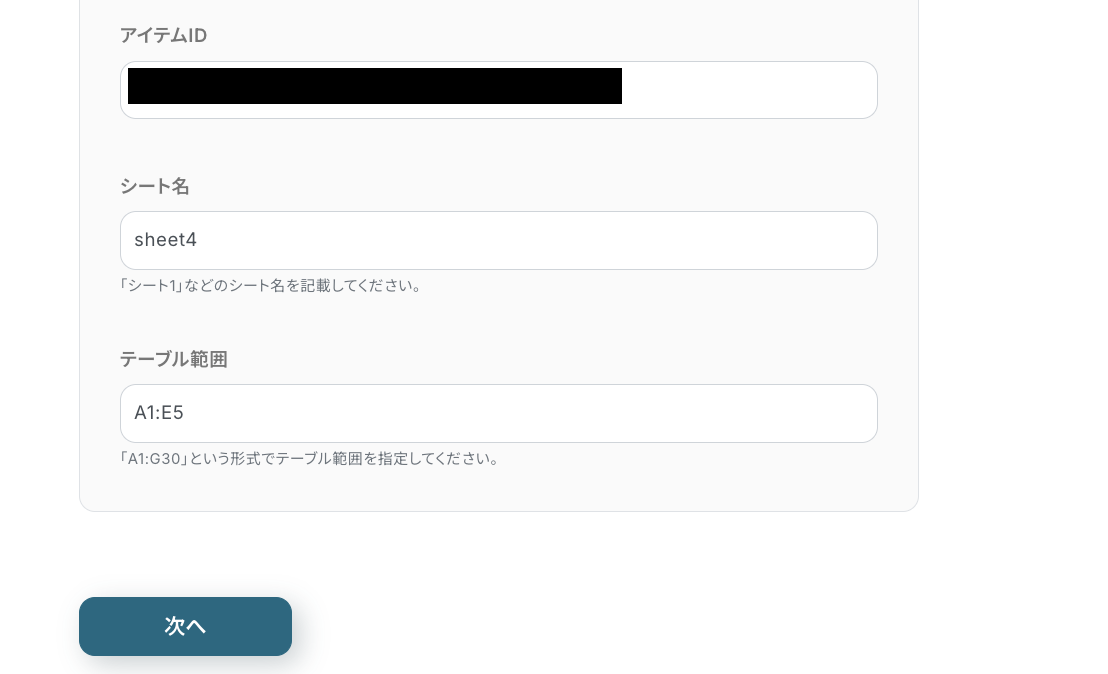(4)「ファイル名」は任意で設定、「アイテムID」「シート名」は候補から選択しましょう。注釈に沿って「テーブル範囲」を設定したら、次へを押します。