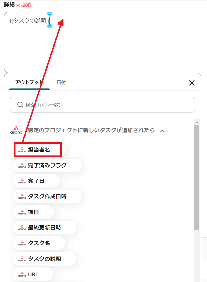 Asanaのデータが一覧表示されるので、追加したい内容をクリックしましょう。