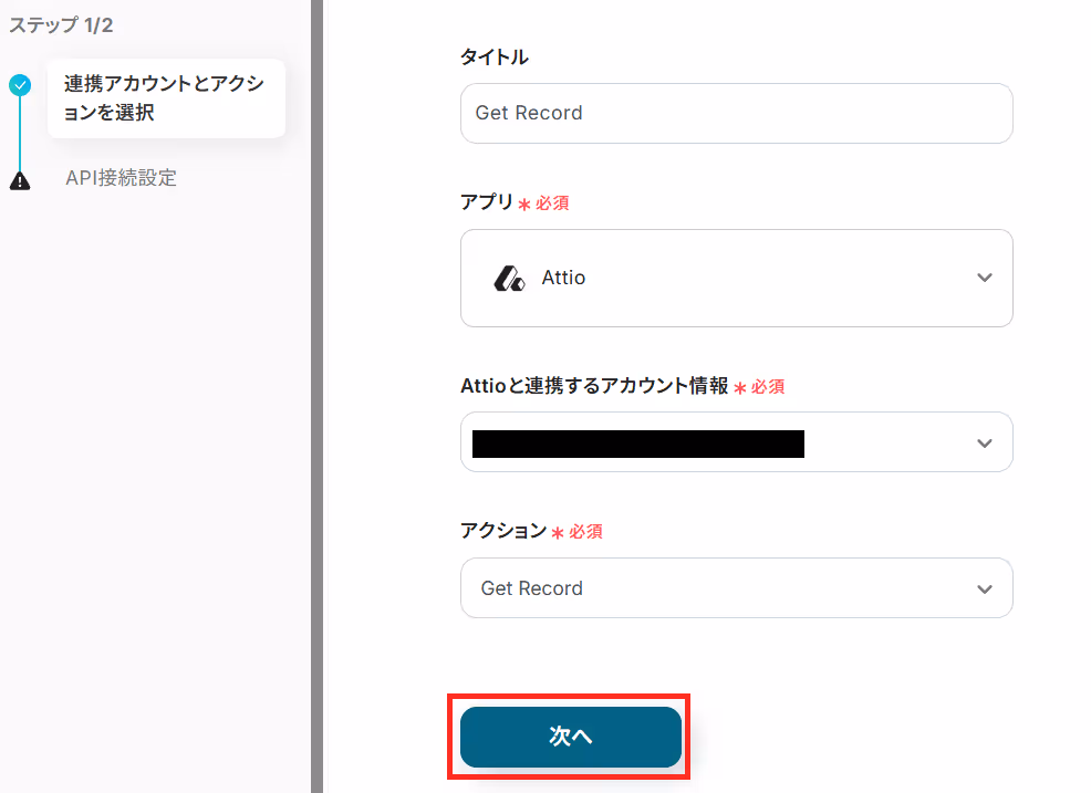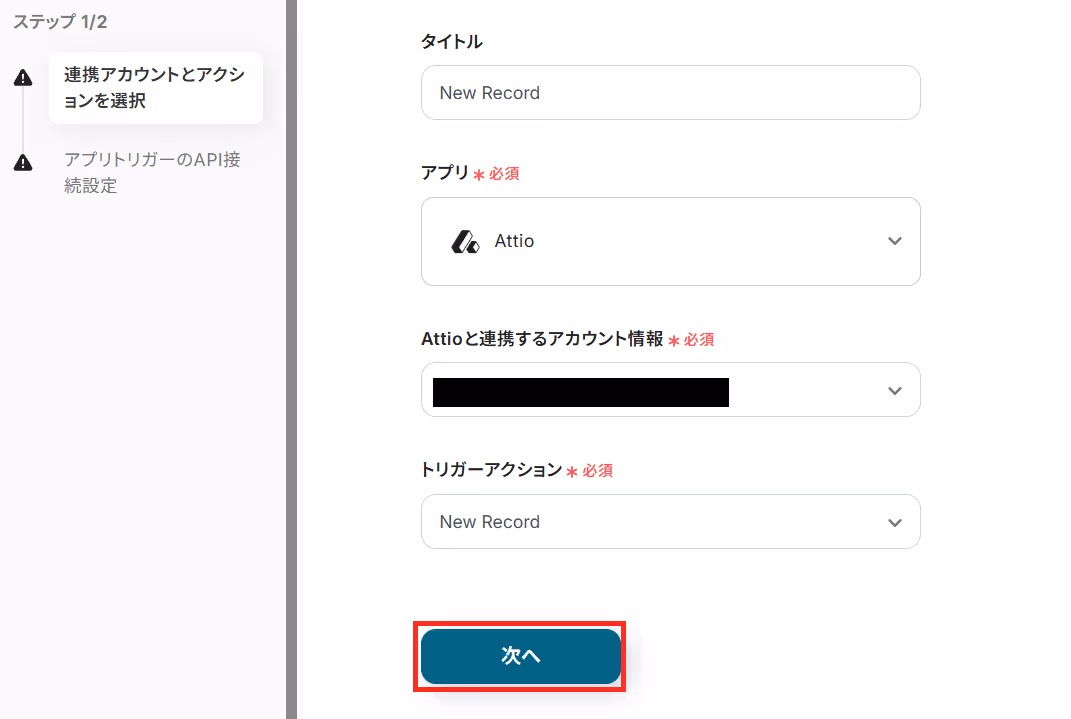 タイトルを任意で設定し、Attioと連携するアカウントやアクション内容を確認したら「次へ」を押してください。