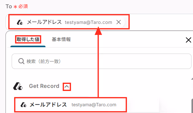 この例では、「To」に先ほどAttioのRecordから取得した値の中から、該当のアドレスを宛先を選択してみます。