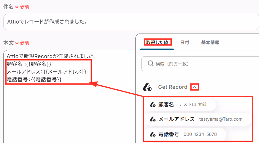 次に、「件名」と「本文」を入力してください。どちらも取得した値を用いて設定を行いましょう。