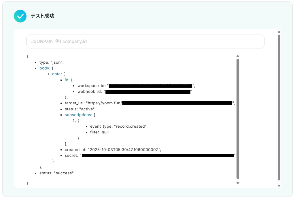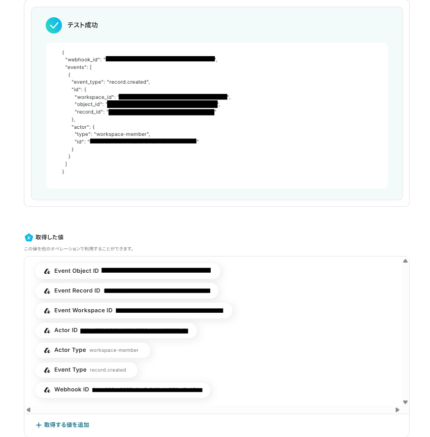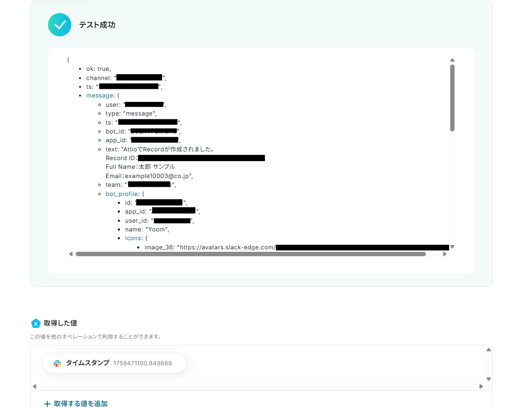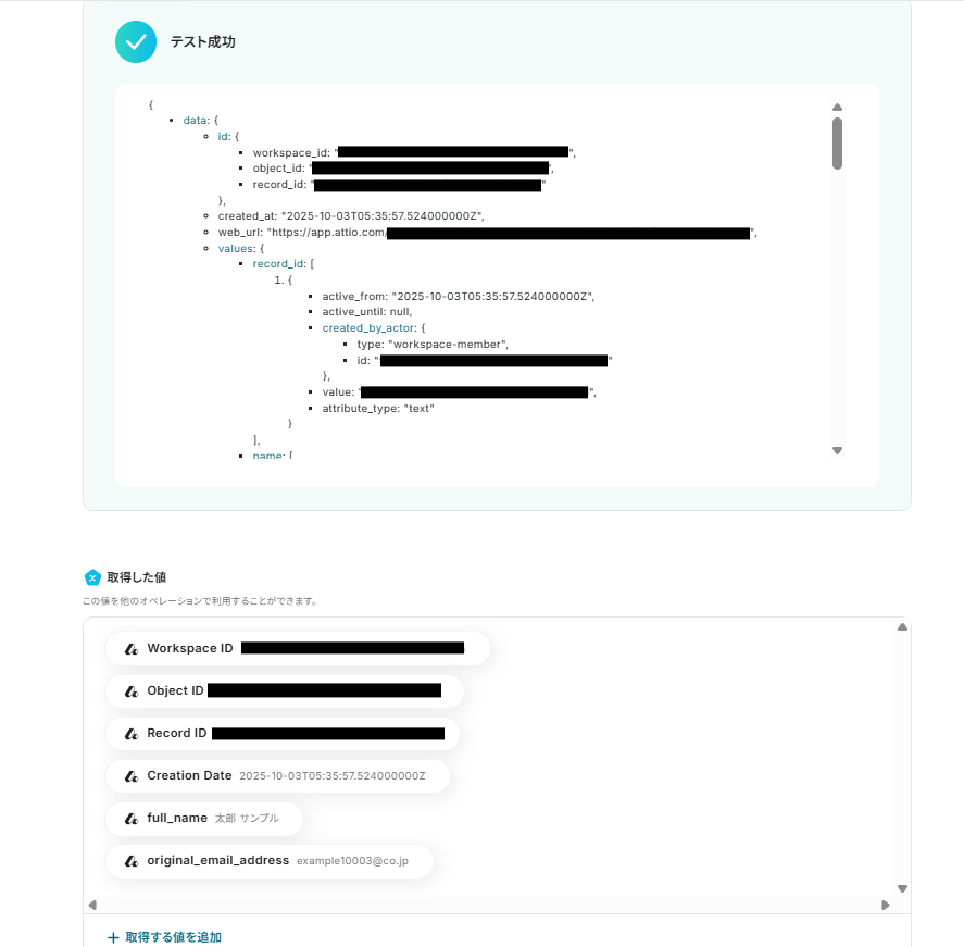 5.戻ったらテストボタンをクリックし、テスト成功画面と「取得した値」にAttioのデータが抽出されていることを確認してください。