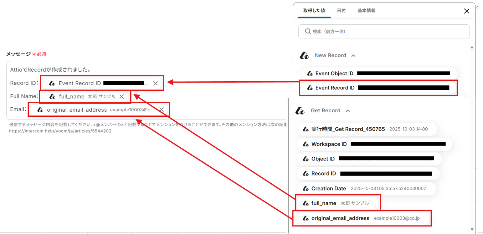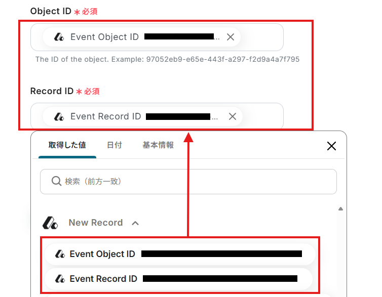 「Object ID」「Record ID」は、入力欄をクリックして表示される取得した値から選択してください。