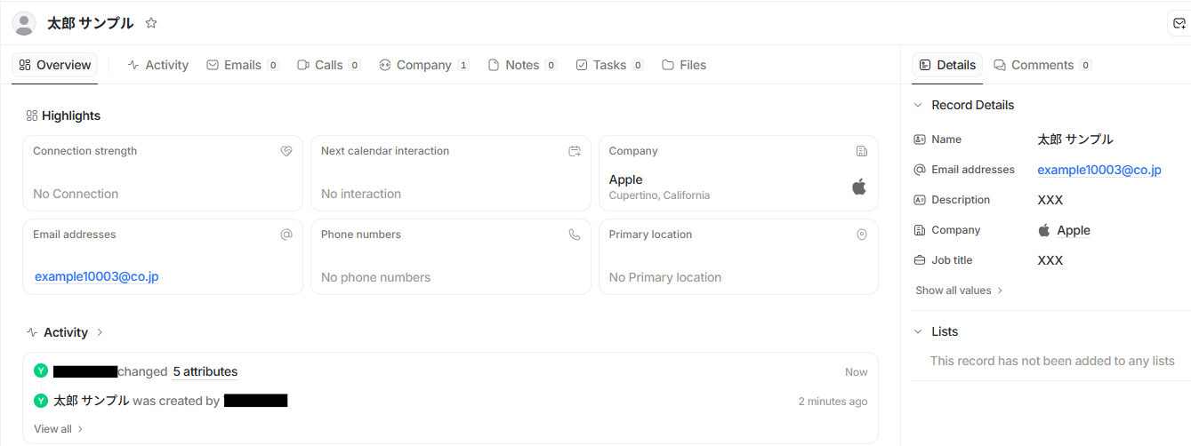 今回は下図のようなRecordを作成してみました。テスト用のため、Recordの内容は架空の情報(「株式会社test」や「テスト太郎」など)でOKです!