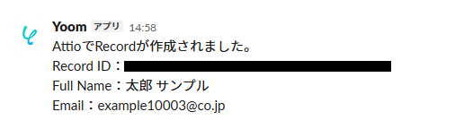 ※なお、テキストを直接入力した箇所は固定値のため定型文となるため、毎回同じ内容が通知されてしまいます。今回の「AttioでRecordが作成されました。」などの文は固定値で設定しても大丈夫ですが、それ以外は取得した値を設定するようにしましょう。