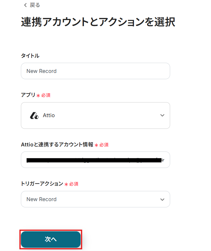 連携するアカウント情報には、ステップ1で連携したアカウント情報が反映されています。トリガーアクションはそのままにして、「次へ」をクリックしてください。