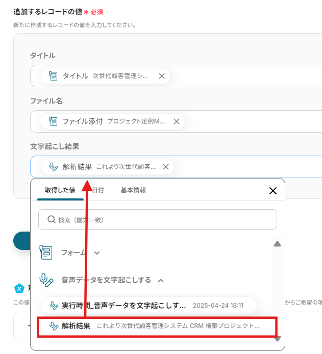 4.「追加するレコードの値」に、先ほど取得したアウトプットを選択します。