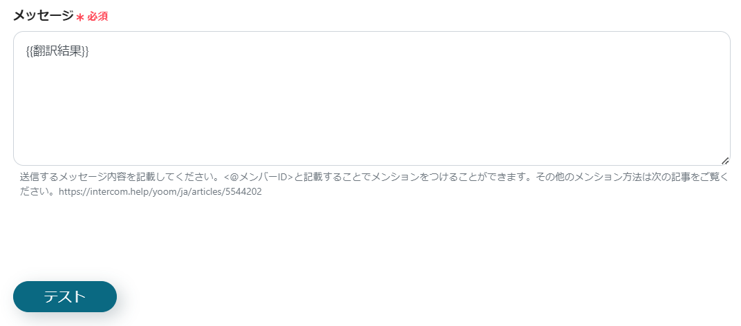 日本語のメッセージをChatworkに送信し終えたらYoomの画面に戻り、テストボタンをクリックします。