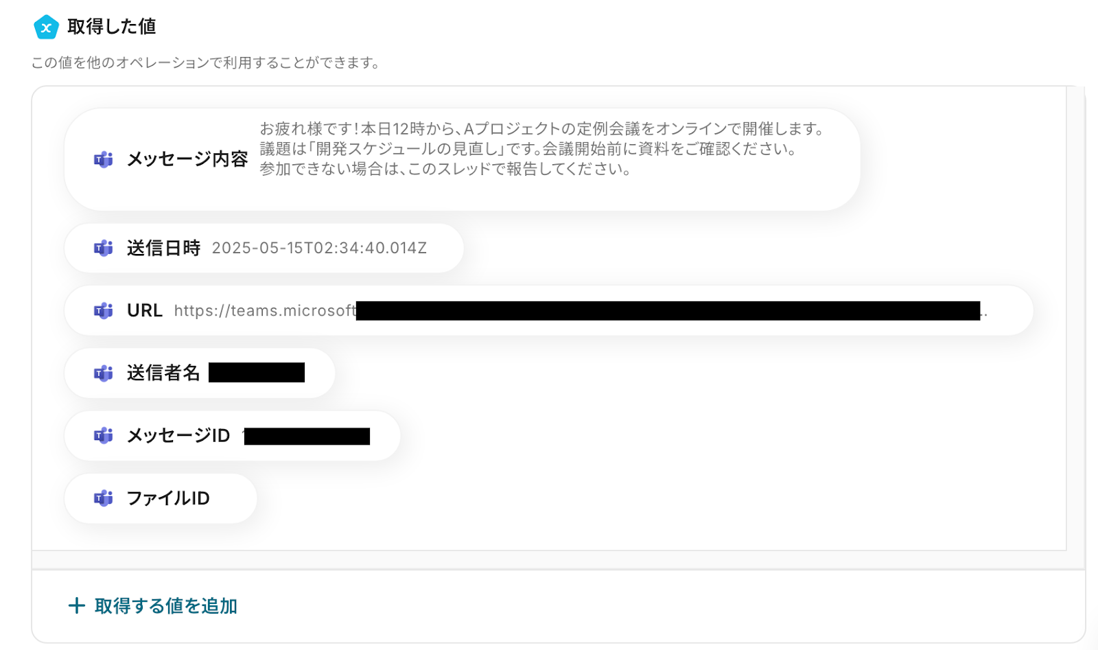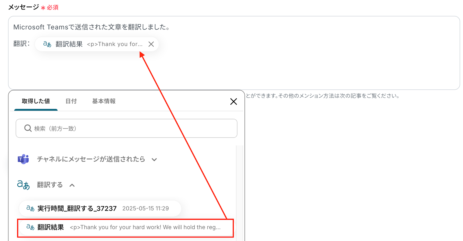 「メッセージ」は、先ほど取得した値(アウトプット)を引用しましょう。
