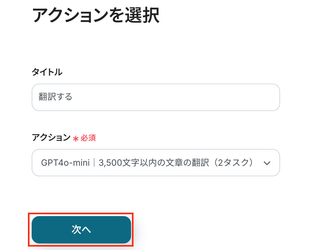 - 続いて、オペレーションでAI機能を選択し、「翻訳する」アクションを設定して、受信したメールの本文を指定した言語に翻訳します。