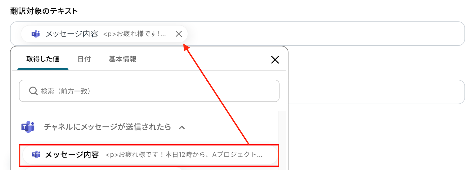 - 最後に、オペレーションでMicrosoft Teamsの「チャネルにメッセージを送る」アクションを設定し、翻訳されたテキストを指定のチャネルに送信します。