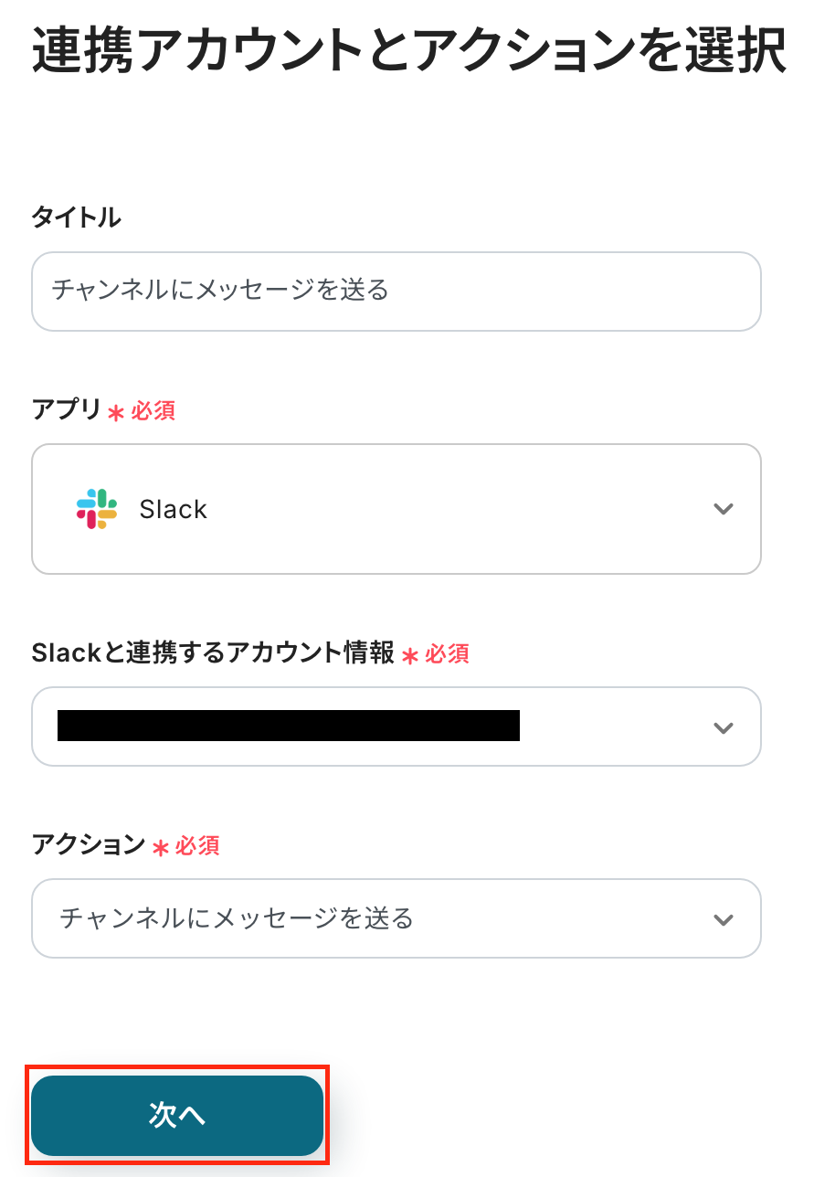 アクションは「チャンネルにメッセージを送る」を選択し、次に進みましょう!