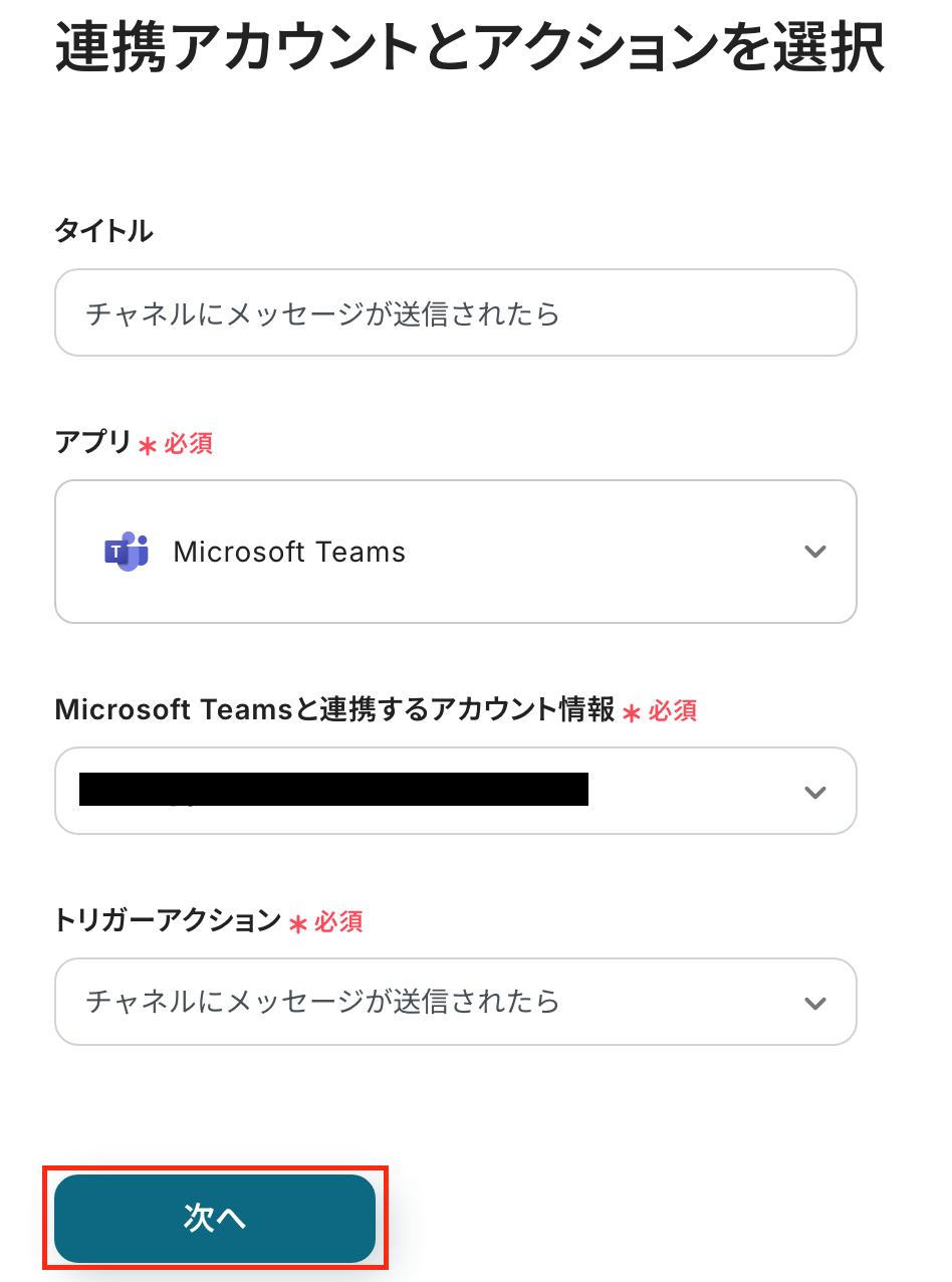 - Microsoft Teamsのトリガー設定では、メッセージの受信対象とするチーム、チャネルを任意で設定してください。