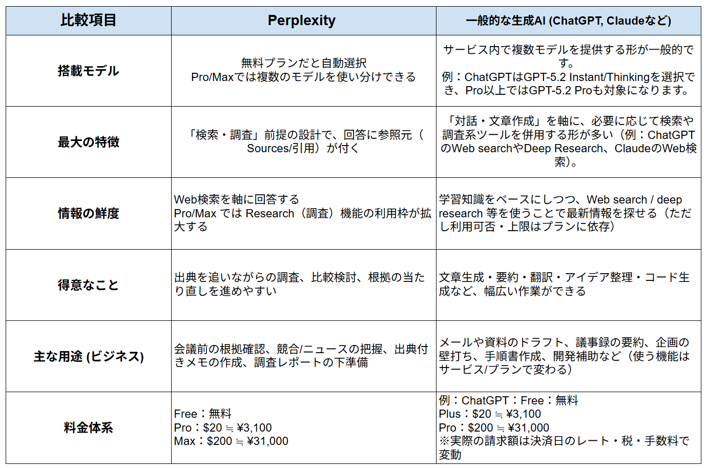 最終的には、「深く掘るところはPerplexity」「読みやすく仕上げるところはChatGPT」というリレー形式で使うのが、内容の充実度と読みやすさを両立しやすい現実的な使い方だと実感しました。