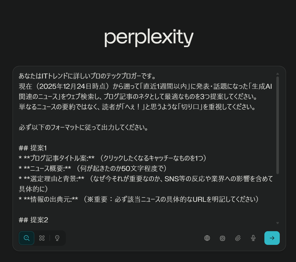 そこで今回は、「直近1週間以内に話題になった生成AIニュース」という鮮度重視の条件をつけ、PerplexityとChatGPTそれぞれに「ブログ記事のネタ候補」を提案してもらいます。