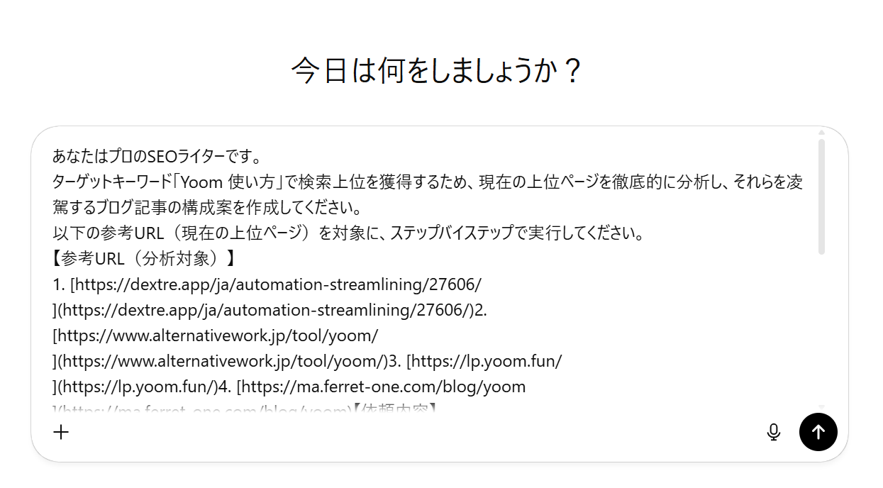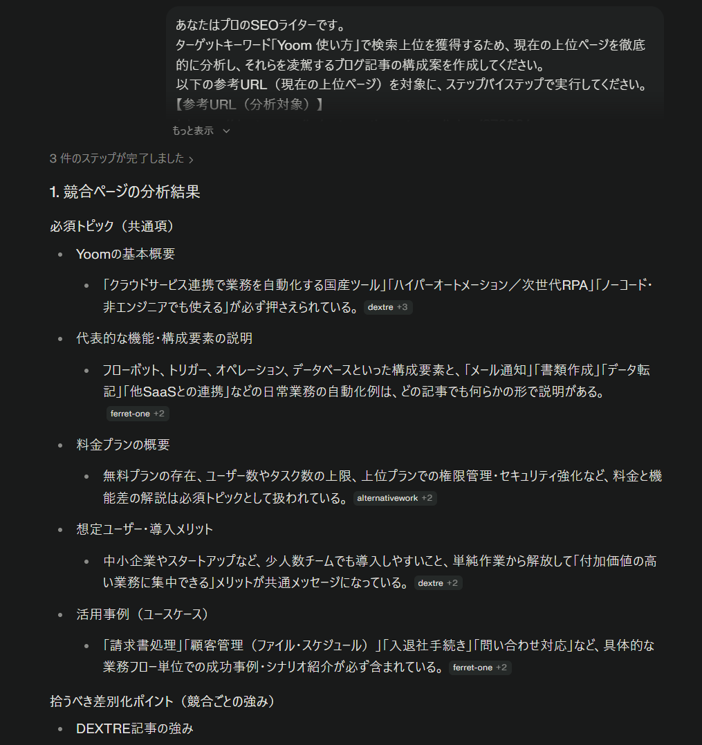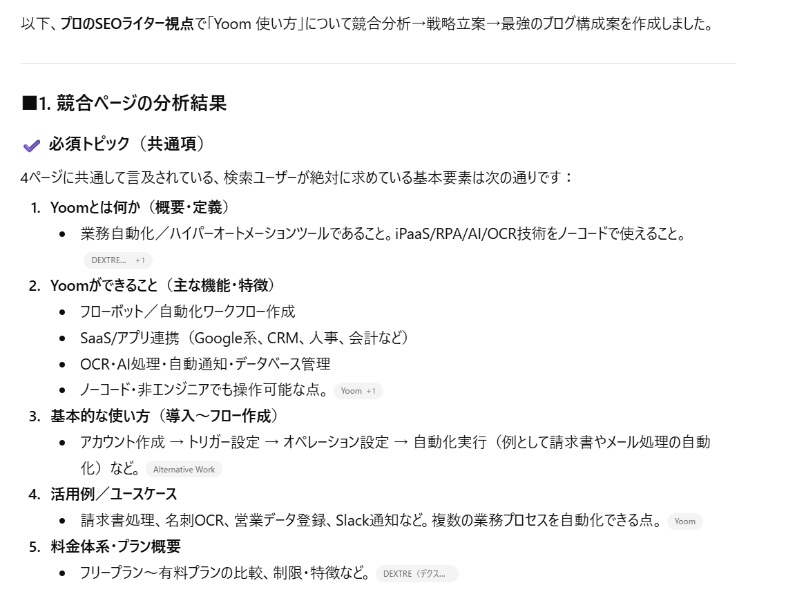想定されるユースケース: ターゲットキーワード(今回は「Yoom 使い方」)で上位表示されている具体的な競合記事を読み込ませ、共通点と差別化ポイントを洗い出した上で、それらを凌駕する「勝てる記事構成案」を作成してもらう。